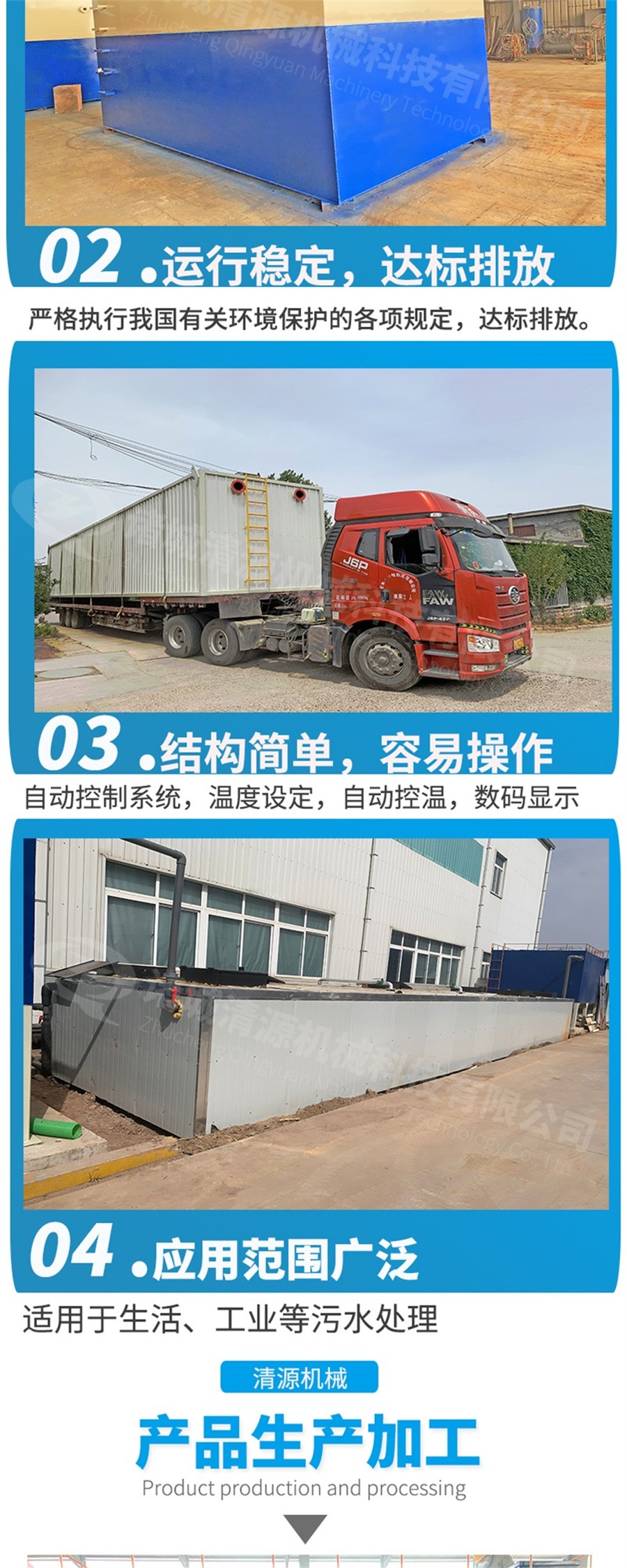 能夠處理生活系統綜合性廢水及其相類似的有機污水;采用玻璃鋼、不銹鋼結構,具有耐腐蝕、抗老化等優良特性,使用壽命長達 50 年以上 全套裝置施工簡單、操作容易,所有機械設備均為自動化控制,全部裝置可設置于地表以下,占地面積小。
