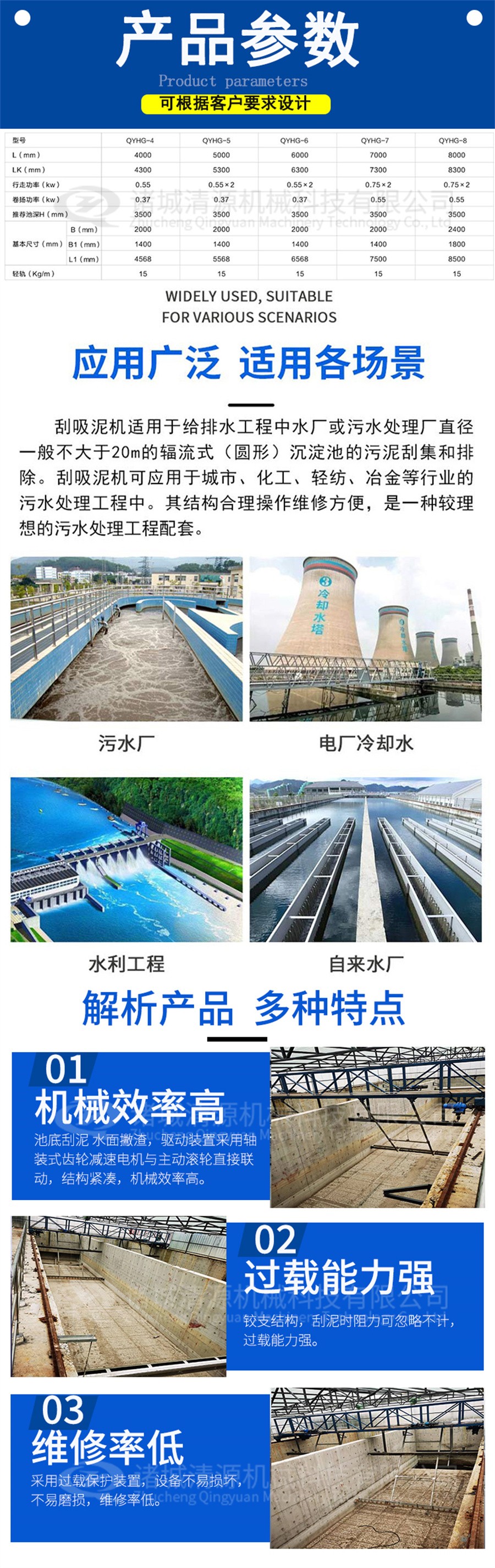 我公司除生產(chǎn)行車式提耙刮泥機(jī)外還生產(chǎn)半橋式周邊傳動(dòng)刮泥機(jī),中心傳動(dòng)刮泥機(jī),污泥濃縮機(jī),污泥脫水一體化等其他污泥濃縮設(shè)備。