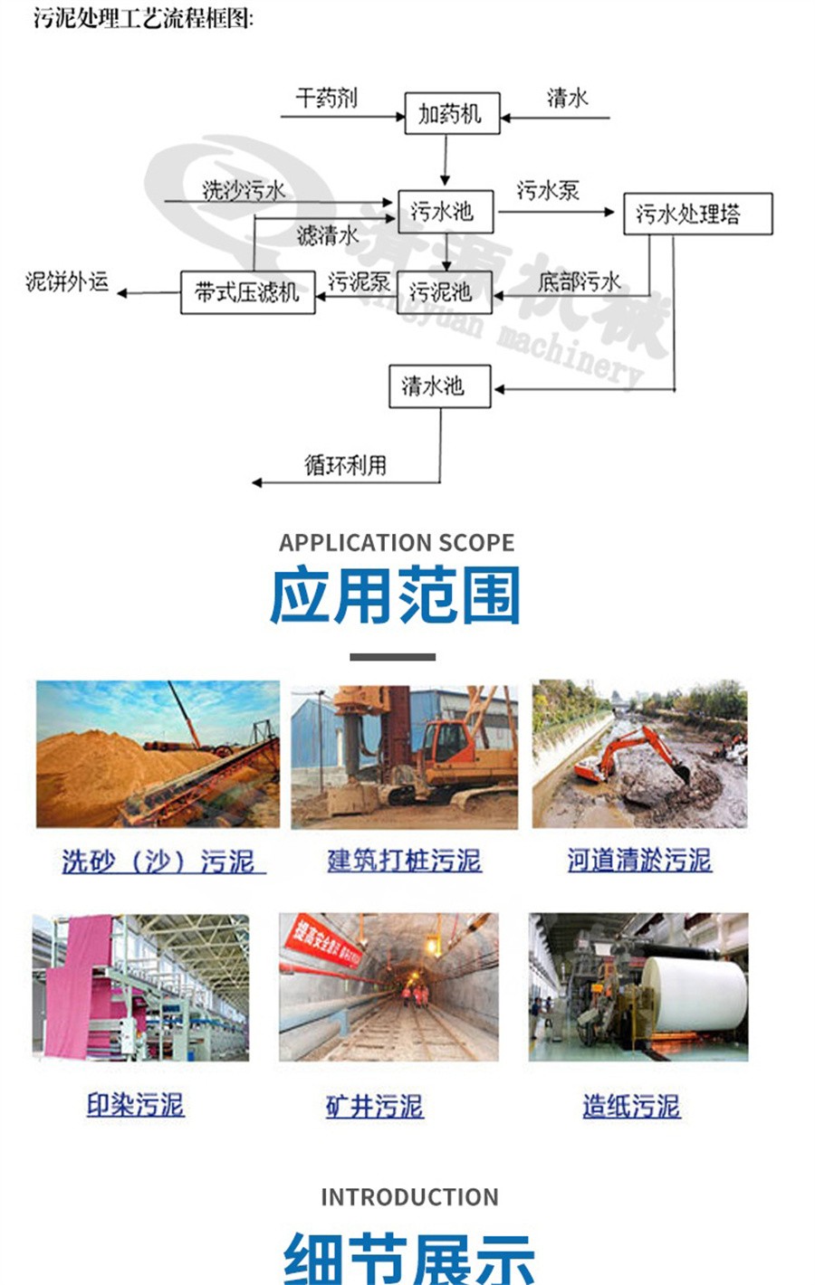 專門適用于制沙場(chǎng)洗沙污水處理,建筑打樁泥漿,砂場(chǎng)泥漿脫水,鉆井泥漿處理,隧道山洞泥漿,洗礦廢水處理等各種泥漿和水的分離。